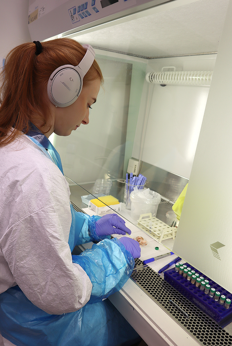 Máney Dögg Hjaltadóttir á príonrannsóknastofunni er hér að skera heilasýni. Mikið kemur af þeim frá sláturhúsum á haustin, í gegnum Matvælastofnun. Máney sker mænukylfuna þar sem mestar líkur eru á að finna riðusmitefni. Sýninu er svo breytt í heilasúpu með því að hakka það. Hún er sett í mótefnaprófabakka sem sýna litabreytingar fyrir jákvæða svörun. Einnig er rannsóknastofan í Evrópuverkefni þar sem rannsakaðir eru íslenskir riðustofnar og arfgerðir í gömlum riðuhjörðum.