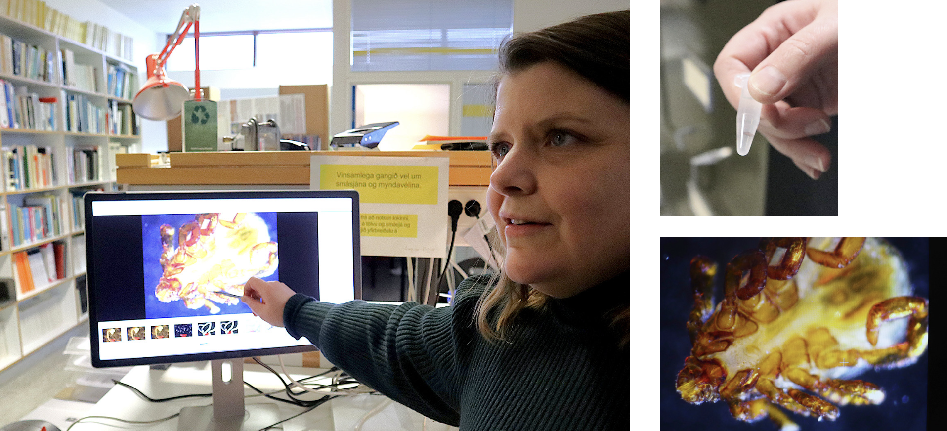 Á sníkjudýradeildinni hafa öll þekkt íslensk sníkjudýr smám saman verið kortlögð og þar að auki eru hér rannsökuð þau óþekktu sníkjudýr sem finnast í landinu. Guðný Rut Pálsdóttir sýnir hér í víðsjá nýfundinn hundamítil. Hann getur lifað og fjölgað sér innandyra og borið bakteríu- og veirusjúkdóma, þráðorma og frumdýr í hýsla sína, þ.á m. menn. Hér eru sníkjudýr í dýrum, og í sumum tilfellum mönnum, rannsökuð. Keldur eru landsbundin tilvísunarrannsóknarstofa m.a. fyrir tríkínur. Sýni frá einangrunarstöðvum fyrir hunda og ketti eru rannsökuð, um 600 dýr á ári. Þá eru rannsökuð sýni frá sláturhúsum og úr hrossum. Annað nýtt sníkjudýr sem fannst hér á landi nýverið er lungnaormur í ketti.