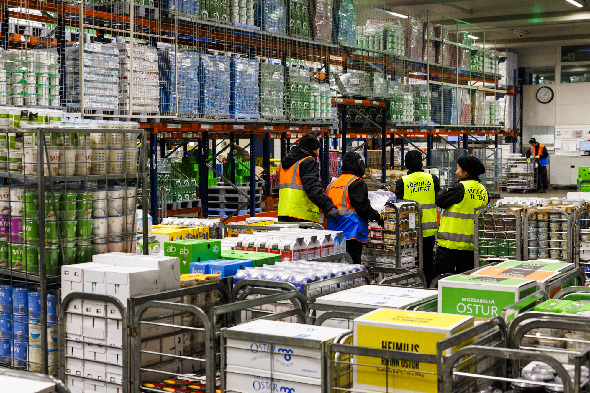 Starfið á lagernum snýst mikið um að taka saman pantanir frá verslunum. Starfsmenn fá útprentaða nótu og raða í vagnana sem fólk kannast við að sjá í mjólkurkælum verslana. „Á blaðinu stendur hversu marga vagna þarf. Svo stendur við hvaða dyraop á að skilja vagninn eftir. Einn starfsmaður fer svo yfir vagninn til að staðfesta að tínt hafi verið rétt magn. Að því loknu geta bílstjórarnir tekið við pöntuninni og dreift í búðir.“