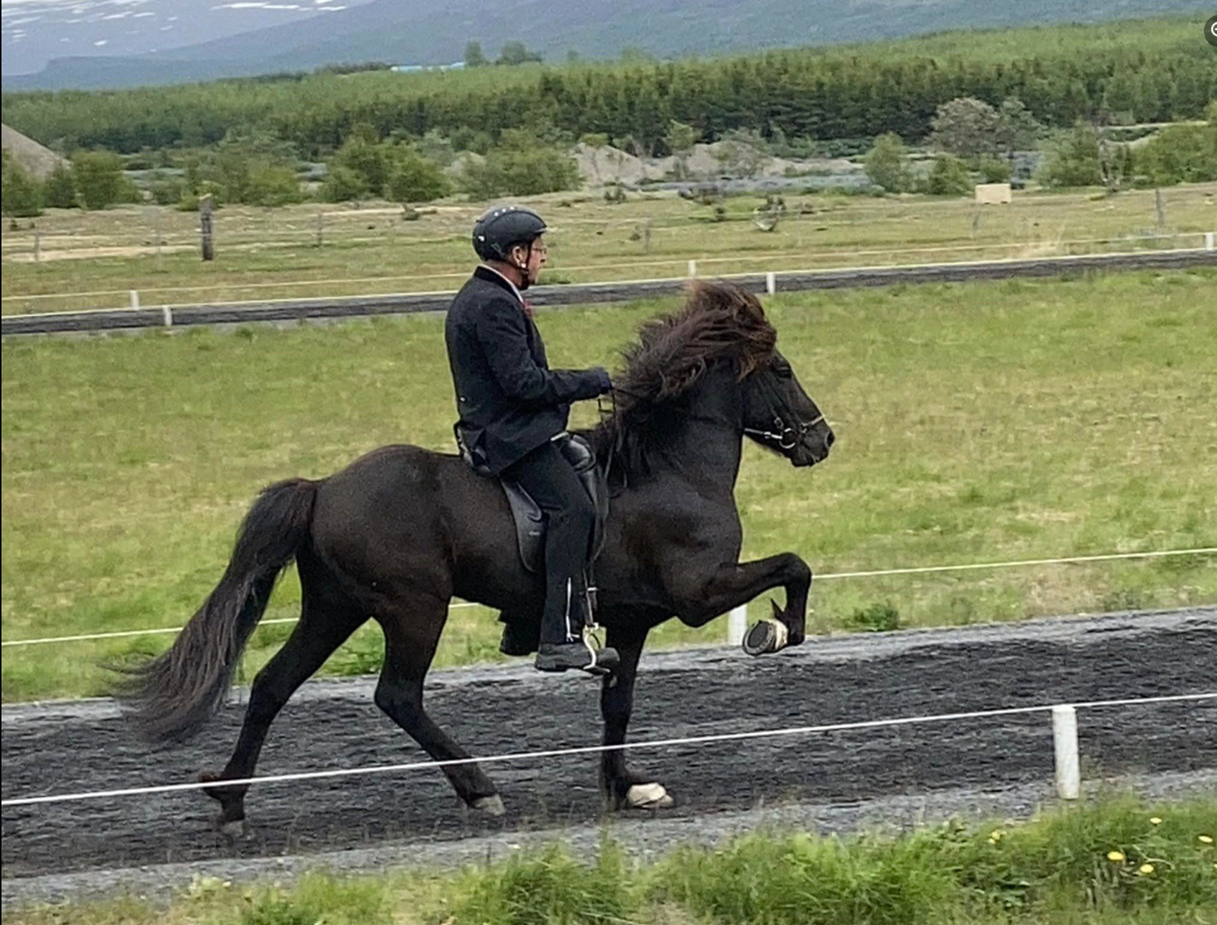 „Þetta er svona hestur sem maður eignast bara einu sinni á ævinni. Eðlisgæðingur, mikill töltari, ljúfur og næmur. Getur lesið hugsanir manns. Hestur sem gefur þér í rauninni alltaf meira en þú biður um. Margverðlaunaður. Síðan varð ég fyrir því óláni að hann var sleginn, var alltaf í hryssum sem graðhestur, og jafnaði sig aldrei á því. Í dag er hann yndislegur reiðhestur. Ég gelti hann til að gefa honum auðveldara líf og geta verið með öðrum hestum,“ segir hann.