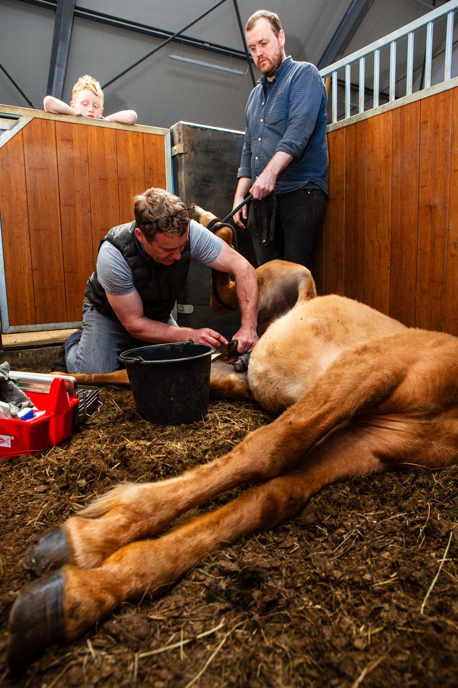Ég er fyrst og fremst í útiverkunum,“ segir Sveinn aðspurður um hvernig hefðbundinn vinnudagur sé hjá honum. „Ég er mikið að keyra á sveitabæi í vitjanir til að sinna kúm, kindum og hestum. Þetta er árstíðabundið, sérstaklega í sambandi við kindurnar. Núna á þessum tíma er alltaf svolítið um burðarhjálp og einn og einn keisaraskurður sem maður framkvæmir. Á þessum tíma er líka mikið verið að gelda veturgamla fola, en graðhestar eru erfiðir og þú getur ekki haft þá með öðrum hestum,“ segir Sveinn. Hann áætlar að hátt í níutíu prósent fola séu geldir.