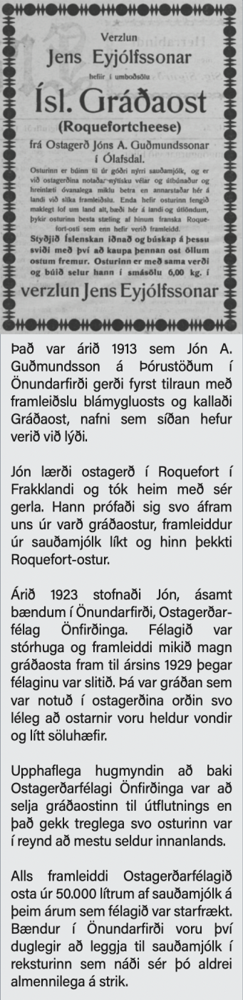 Eyþór Jóvinsson á Flateyri hefur leitt endurvakningu Ostagerðarfélagsins, sem síðast starfaði árið 1929. Stendur til að nýta hráefni úr nærsveitum og halda sögu félagsins á lofti.