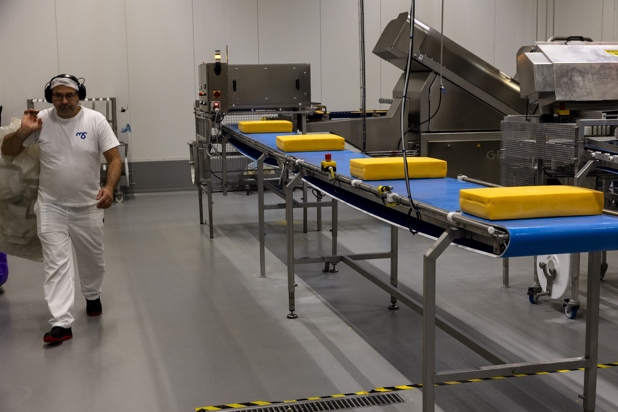 Inni á hreina svæðinu les færibandið merkingarnar á blokkunum og deilir ostinum á viðeigandi stað á færibandinu. „Skynjararnir sjá hvar er pláss og kalla eftir þeim ost sem vantar hverju sinni. Það er engin hönd sem kemur að því.