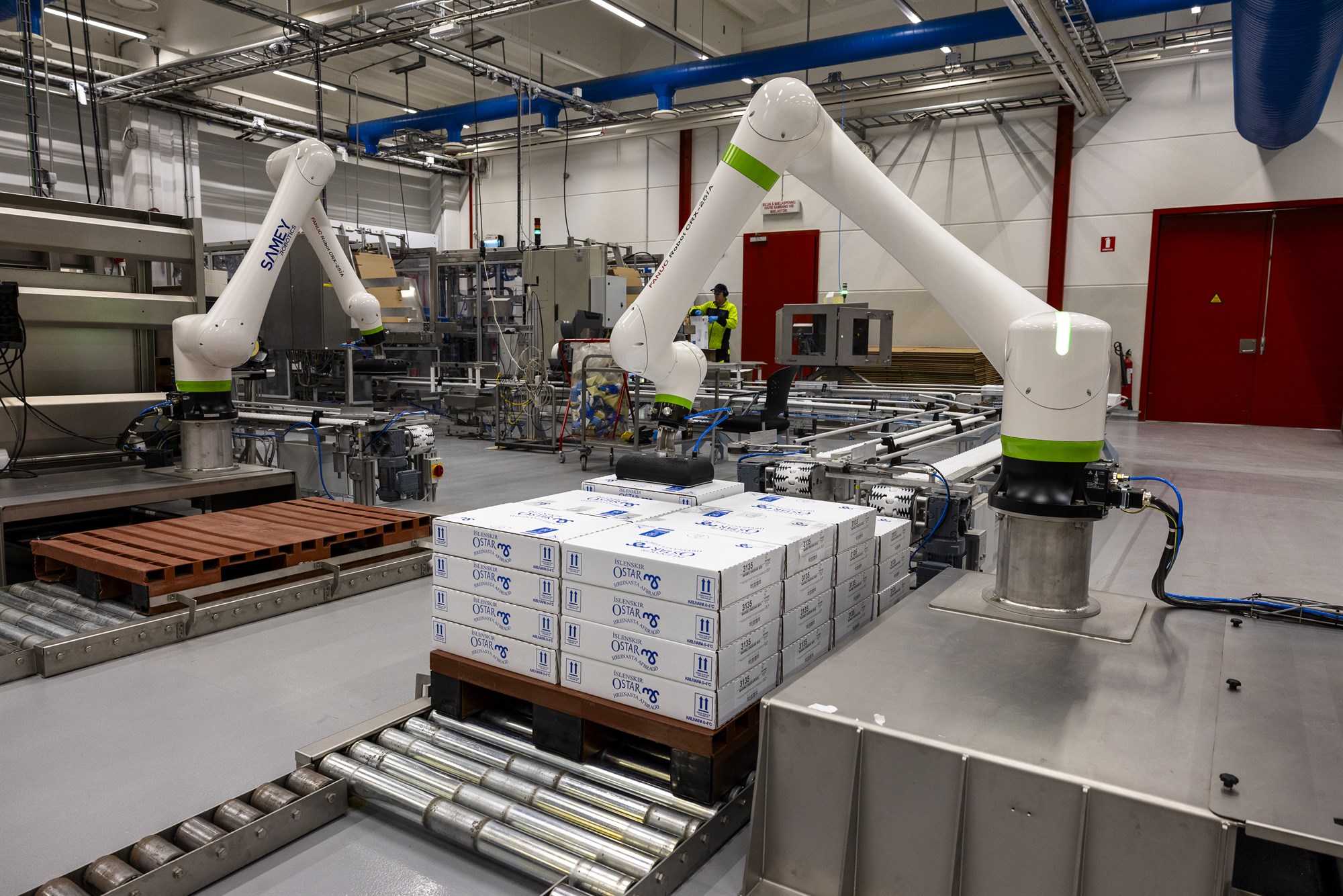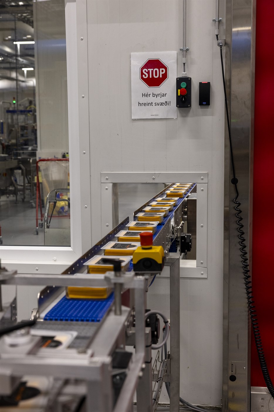 Færibandið byrjar í sérstöku móttökurými. Þaðan fer osturinn yfir á svokallað hreint svæði þar sem blokkirnar eru teknar úr umbúðum, þær skornar niður og pakkað í sölueiningar. Fullpökkuð vara ratar svo í sama rými og færibandið byrjar, þar sem hún er sett í kassa og starfsmenn koma ostinum í vörugeymslu. „Hérna eru bara tveir starfsmenn sem sjá til þess að koma öllum osti inn og taka allan ost frá. Ef við tækjum allan vélbúnaðinn í burtu og þetta væri unnið eins og í kringum 1980 þá þyrftu starfsmennirnir að vera nokkuð margir,“ segir Arnar.