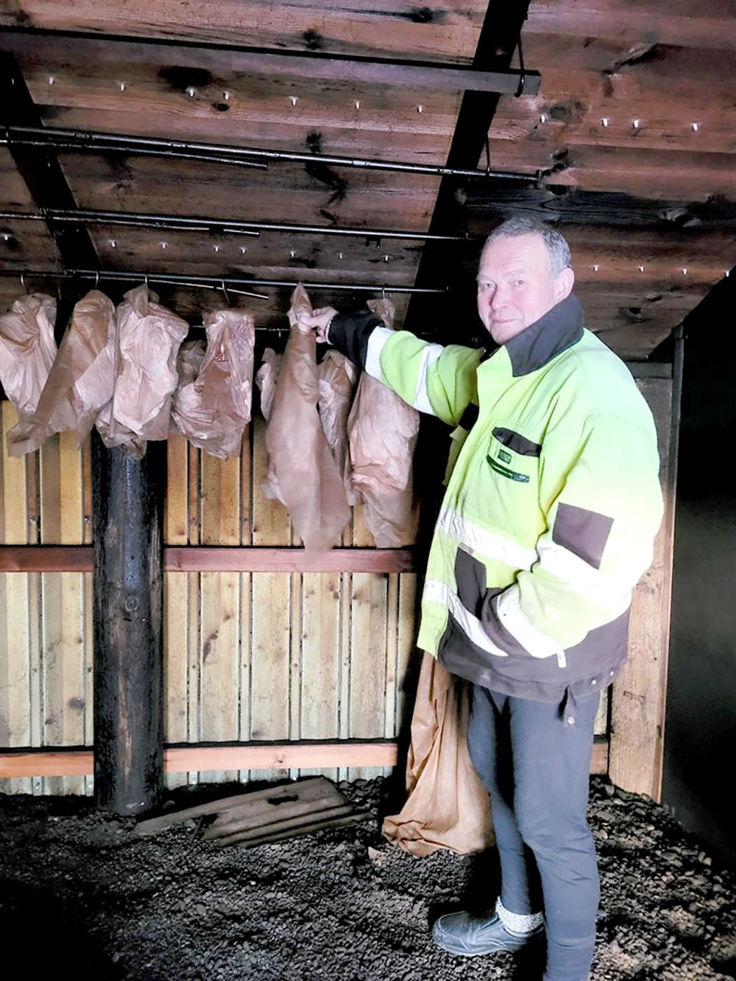 „Í nóvember förum við að undirbúa hangikjötsframleiðsluna með því að úrbeina og setja í saltpækil. Við úrbeinum allt sem á að úrbeina áður en sett er í saltpækilinn til að spara plássið í pæklinum. Við erum með kör sem við söltum í og höfum mislangan tíma í salti eftir stærð og hvort það er með beini eða ekki. Við tökum svo upp og látum renna af áður en það er hengt upp í reykhúsið. Við setjum utan um allt kjöt sem fer í reyk, til að verja það sóti. Reykhúsið var endurbyggt fyrir nokkrum árum. Við erum með slár upp við loft og hengjum á þær með stálkrókum. Við erum með lambakjöt, sauðakjöt og ærkjöt,“ útskýrir Hafdís.