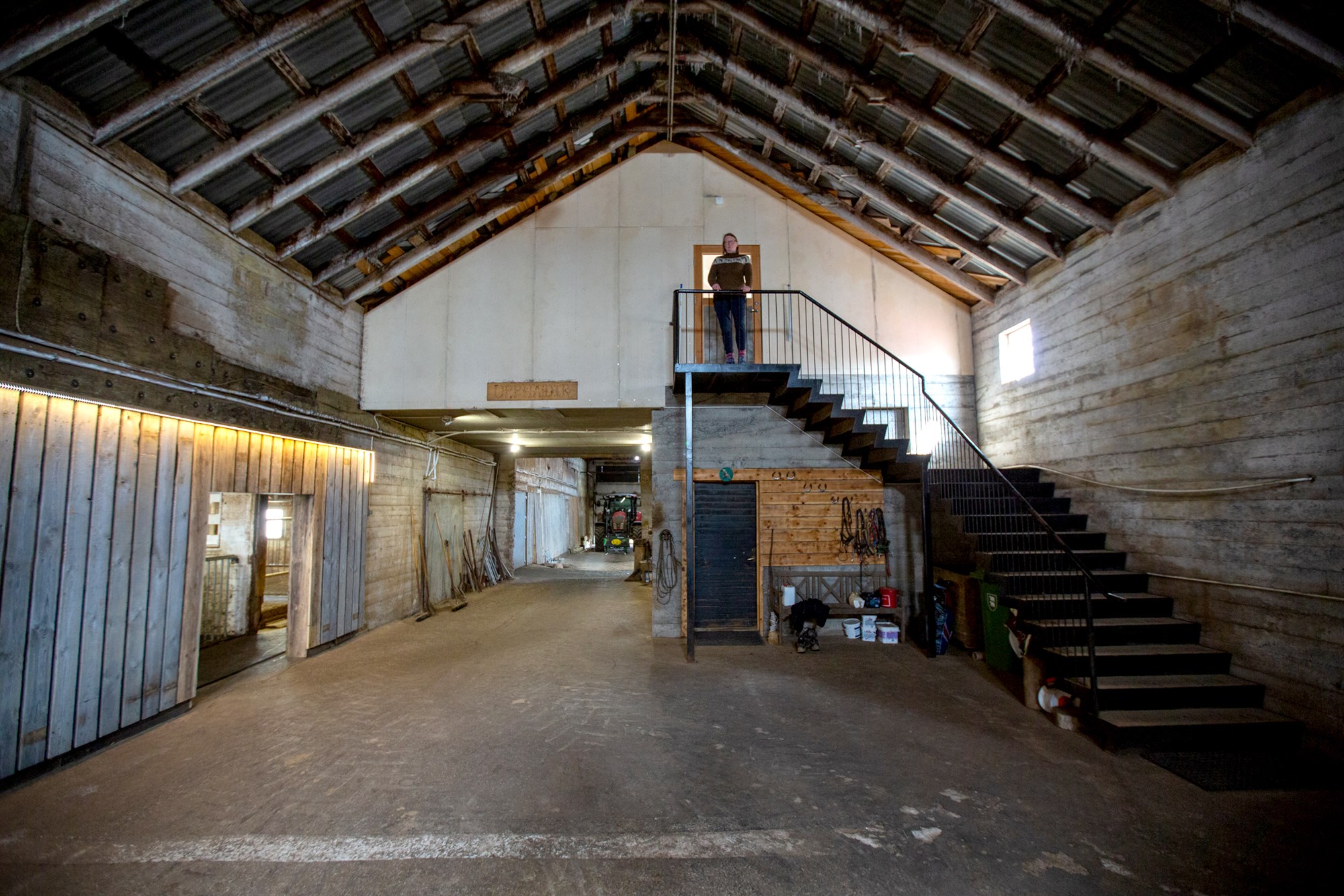 Þau byrjuðu á því að útbúa, þar sem áður voru hlöður, einangrað herbergi fyrir salerni og verkfærageymslu. Þá sáu þau að hægt væri að útbúa kaffistofu þar fyrir ofan. Vegna tæknilegra atriða endaði kaffistofan á að vera helmingi stærri en upphaflega stóð til og þar sem þau voru að þessu til að byrja með ákváðu þau að gera aðstöðuna mjög góða. Þau eru því með nánast fullbúin híbýli í fjósinu og segja þau margar sölur á hestum hafa átt sér stað þar. Þar séu öll hádegishlé tekin og þurfa Guðný og Jóhann ekki að koma heim í bæ fyrr en á kvöldin. Til þess að gera vélagengt undir kaffistofuna er hún býsna hátt uppi og hefur því fengið viðurnefnið Upphæðir.