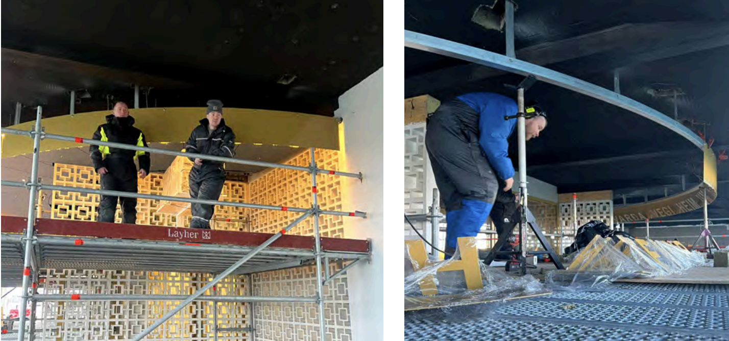 Skrautveggurinn er til dæmis langt frá því að vera beinn,“ segir Jóna glottandi og bætir við að það hafi þurft að skera loftplöturnar á ýmsa vegu öfugt við þegar unnið er við nýbyggingar þar sem allt er hornrétt og loftplötum vanalegast bara skellt upp. Með það í huga má sjá að hringform verksins hafi ekki alltaf verið auðveld. „Ég spurði arkitektana oftar en einu sinni hvað við hefðum verið að pæla að gera hringform – en á móti kemur að fólki líður víst best í þess háttar rými, bæði bogadregnu og ósymmitrísku. Þetta verk er klárlega það. Boginn með textaverkinu er til dæmis ekki 180 ° en opnar því sjálfsagt hið notalegasta rými. Að auki gerir sér örugglega enginn grein fyrir þessu þars em það munar nú rosalega litlu.“
