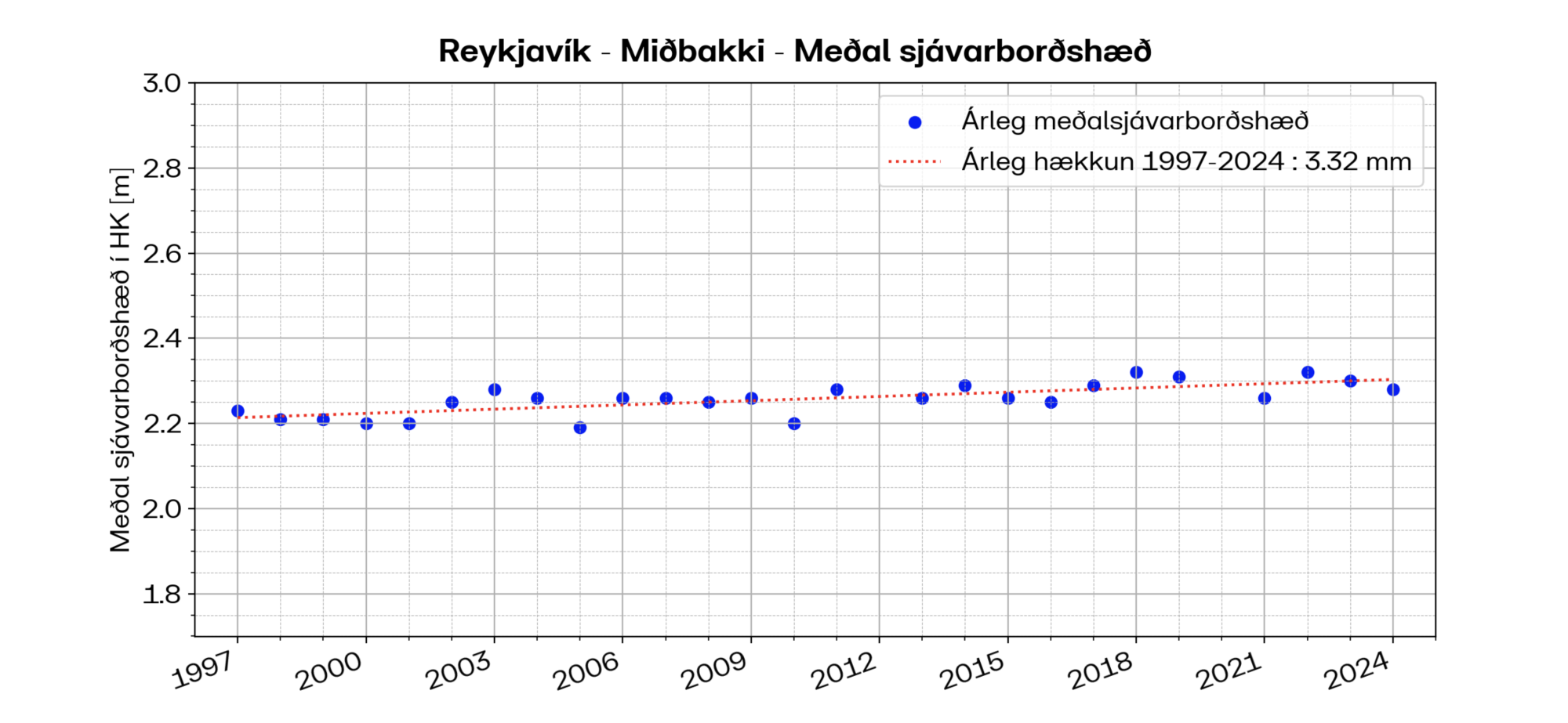 Anna Hulda Ólafsdóttir, skrifstofustjóri loftslagsþjónustu og aðlögunar hjá Veðurstofu Íslands, segir sjávarstöðu hafa hækkað hér við land. „Samkvæmt mælingum í Reykjavík frá 1956–2022 hefur sjávarstaða að jafnaði hækkað um 2,3 mm á ári [1,8-2,8 mm] á því tímabili. Þetta er örlítið meiri hækkun en áður var metin (2,0 mm/ári 1957–2014) og bendir til aukinnar hækkunar á síðustu árum,“ segir hún.