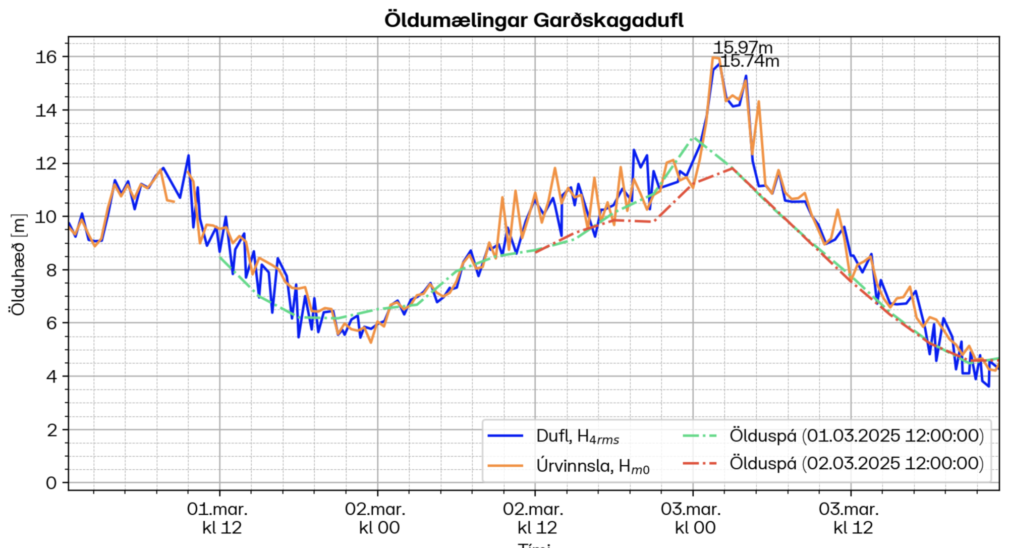 „Það var slæmur atburður síðasta vetur sem mun sennilegast lifa lengi í manna minnum, þ.e. óveðrið 1.–3. mars. Í þeim atburði gaf víða á land á sunnanverðum Faxaflóanum með tilheyrandi tjóni og raski á daglegu lífi. Það er margt sem bendir til þess að atburður af þessari stærðargráðu sé sjaldgæfur. Þar má nefna að hjá Garðskagadufli mældist nær 16 m há kennialda sem er næsthæsta staðfesta kennialda síðan 1996. Einungis í atburði 8. febrúar 2022 mældist hærri kennialda en 3. mars 2025. Þegar endurkomutími hæstu öldu atburðarins er metinn, kemur í ljós að slík ölduhæð hefur um 30 ára endurkomutíma. Það sem þótti einnig sérstakt í þessum atburði var ríkjandi vestanátt á öldunum, en öldur með slíka stefnu á þessu svæði eru alla jafna lægri en öldur úr suðvestri,“ segja þau. Ef tekið sé tillit til öldustefnu þá sé endurkomutími hæstu öldu atburðarins yfir 50 ár.