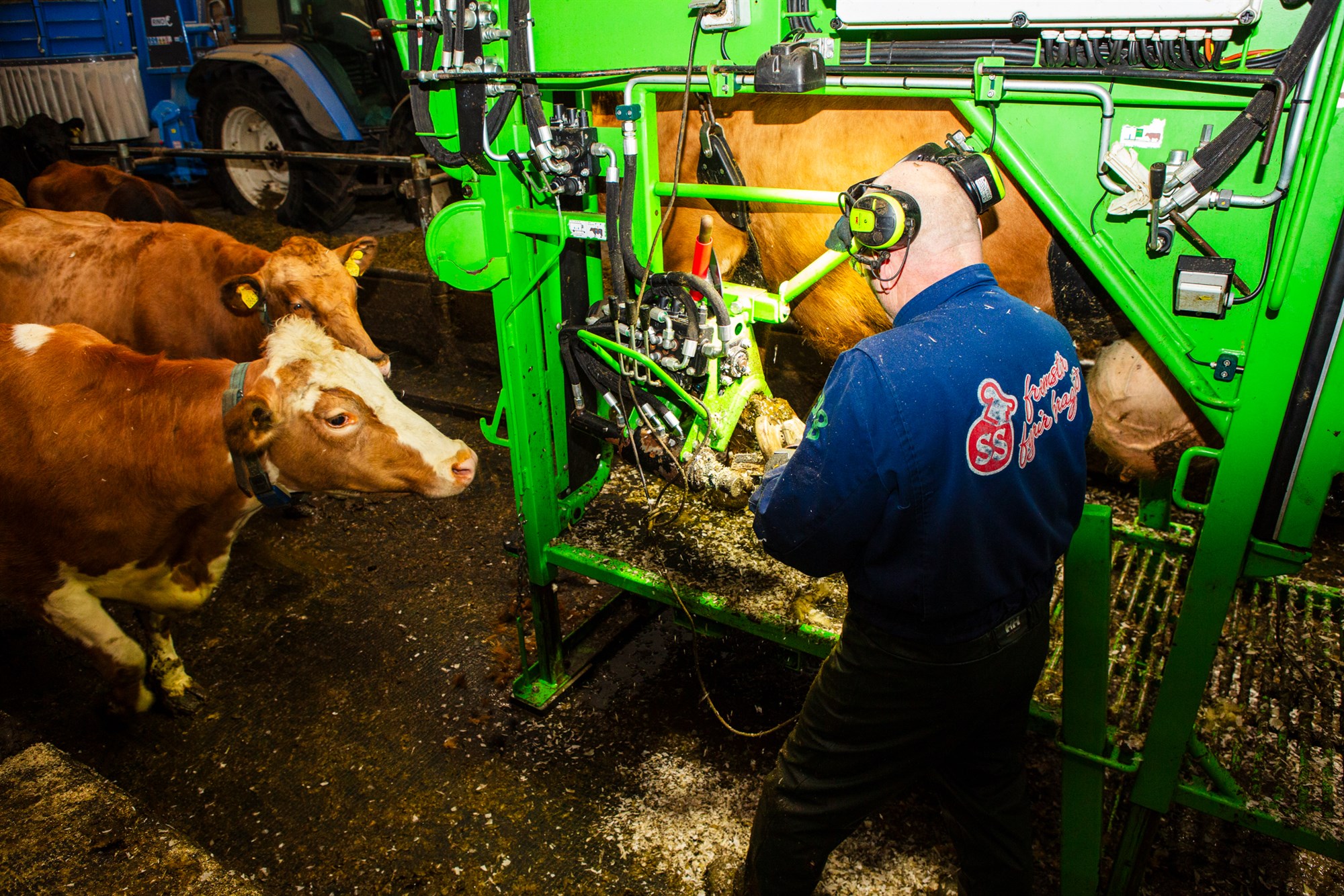 Búnaðarsamband Suðurlands festi nýlega kaup á klaufsnyrtibás sem tryggir öryggi og þægindi kúa. Hérna nýtir Samúel Eyjólfsson, bóndi í Bryðjuholti, tækifærið og snyrtir hár á nokkrum stöðum á kúnum, eins og á júgra, eyrum og hala.