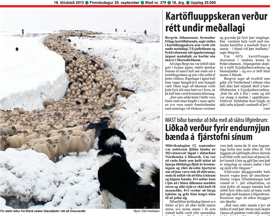 Fyrir fimm árum, þann 20. september 2012, birtist á forsíðu blaðsins mynd þar sem fé er rekið í slóða í gegnum mikinn snjóskafl niður frá svokallaðri Rönd, neðan Gæsafjalla, í átt að Hraunsrétt.
