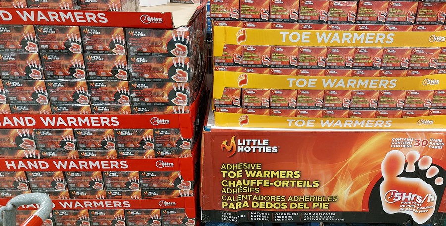 Fyrir nokkrum árum skrifaði ég um upphituð undirföt sem ég prófaði frá framleiðanda í Bangladesh sem heitir Fieldsher. Nú er hægt að fá svona vettlinga með rafhlöðu sem heldur vettlingnum heitum/volgum frá 2 klukkutímum upp í 10 tíma á rafhlöðunni. Slíkir vettlingar voru fáanlegir fyrir áramót í Costco og kostaði parið um 16.000. Ég á svona par og hef prófað og þetta virkar fínt. Einnig er hægt að fá einnota hitapoka sem maður setur inn í vettlinga sem duga í allt að sex tíma og litla leppa fyrir tær sem maður límir neðan á sokkana áður en maður fer í skó (fæst í kassavís í Costco). Sjálfur er ég með hvort sína pakkninguna (fyrir hendur og tær) í vasanum á vinnuúlpunni allan veturinn.