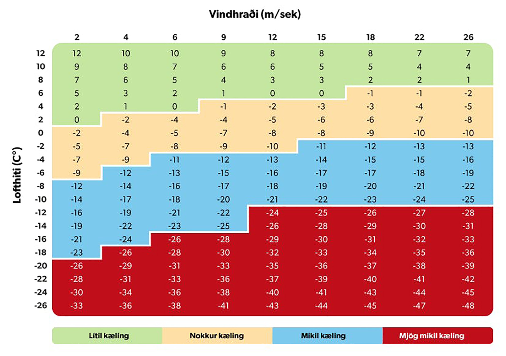 Ef hitinn er á bilinu +2 til -2 gráður er vindkælingin fyrir skokkarann, hestamanninn og gönguskíðamanninn þá á bilinu -3 til - 8 gráðu frost. Í sama hita á fjórhjóli er vindkælingin -5 til -11 gráður, en á vélsleðanum gæti hún verið allt að -13 gráðu frost. Því er ágætt að leggja á minnið vindkælingatöfluna á myndinni með þessari grein.