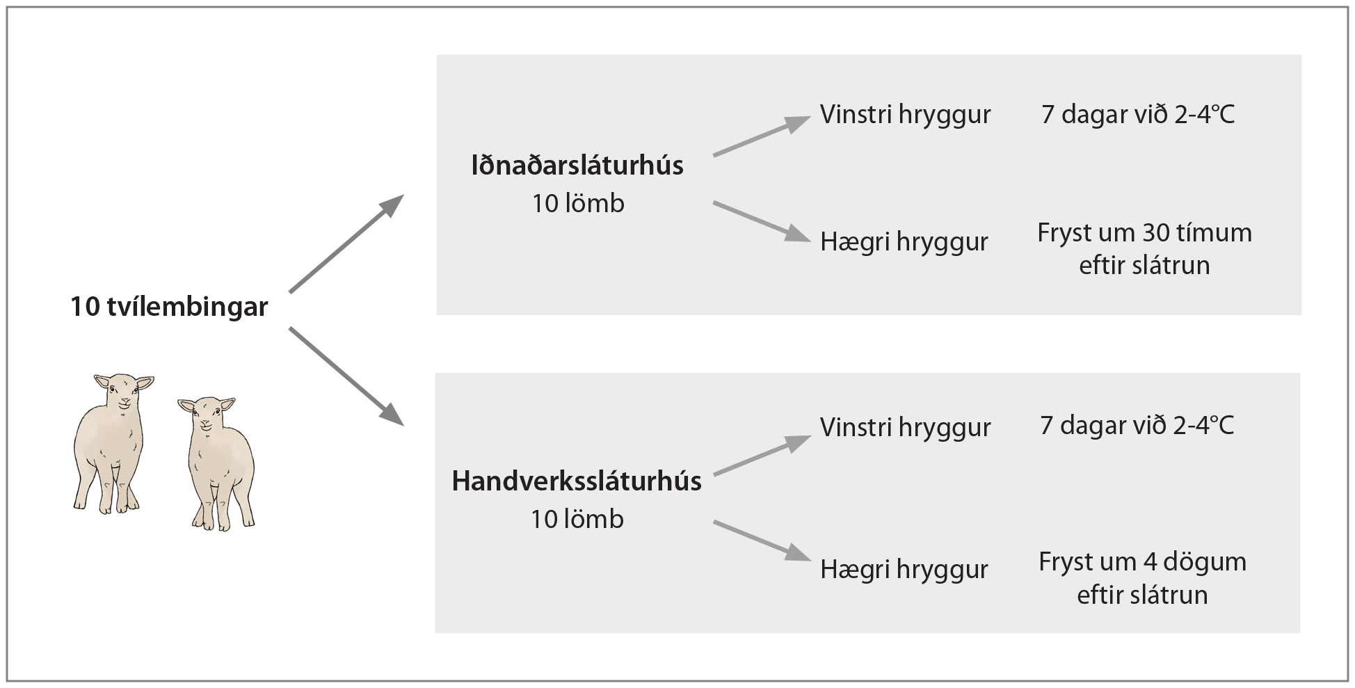 Handverkssláturhúsið sem um ræðir er í Seglbúðum í Landbroti og iðnaðarsláturhúsið er Sláturfélag Suðurlands (SS) á Selfossi og fóru rannsóknir á afurðunum fram síðastliðið haust. Hjá SS var notast við rafdeyðingu, skrokkarnir fláðir hangandi, raförvaðir og kældir hratt niður fyrir frystingu – sem var daginn eftir slátrun. Í handverkssláturhúsinu var pinnabyssa notuð við deyðingu, notast var við bekkfláningu, hægari kælingu og meyrnun í fjóra daga fyrir frystingu.
