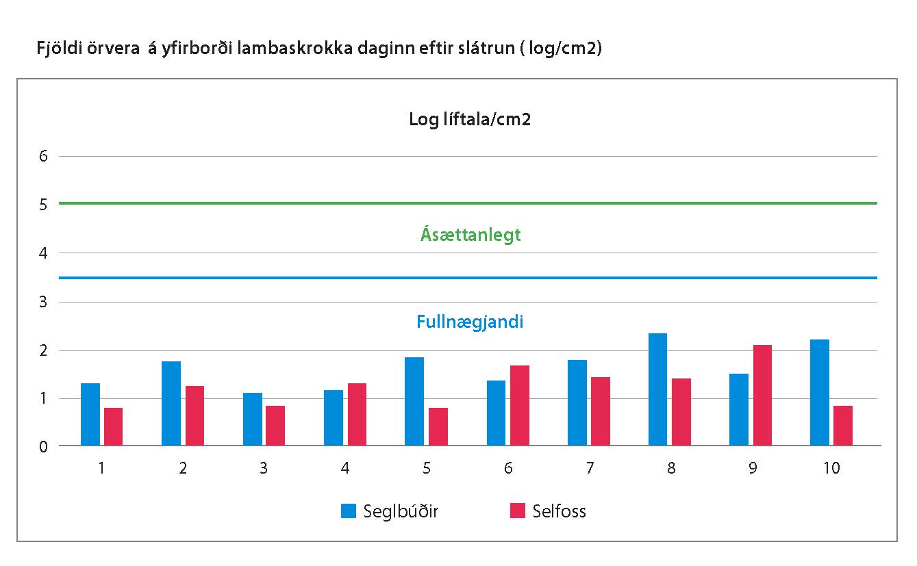 Ekki var teljandi munur á fjölda örvera á yfirborði kjötskrokka, hvort sem notast var við bekkfláningu eða hangandi fláningu og engir iðragerlar mældust.