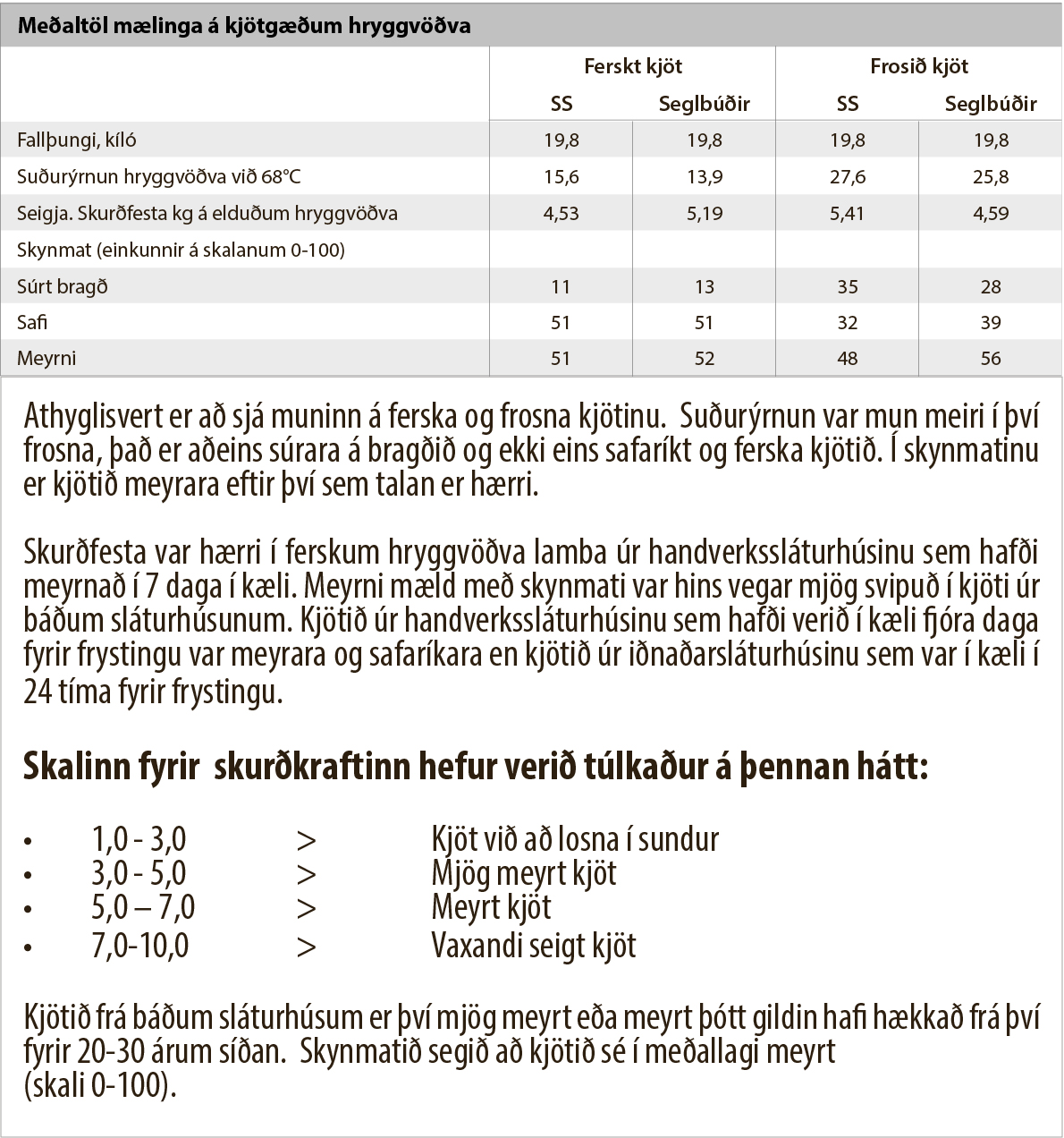 Ferska kjötið frá SS reyndist ívið meyrara en það ferska frá Seglbúðum, en öll sýni voru fullnægjandi meyr. Ferska kjötið var jafn safaríkt en í skynmati kom fram aðeins súrara bragð af kjötinu frá Seglbúðum. Frosna kjötið var nokkuð meyrara frá Seglbúðum, auk þess sem suðurýrnun var minni. Þá var bragð ekki eins súrt úr skynmati af frosna kjötinu frá Seglbúðum.