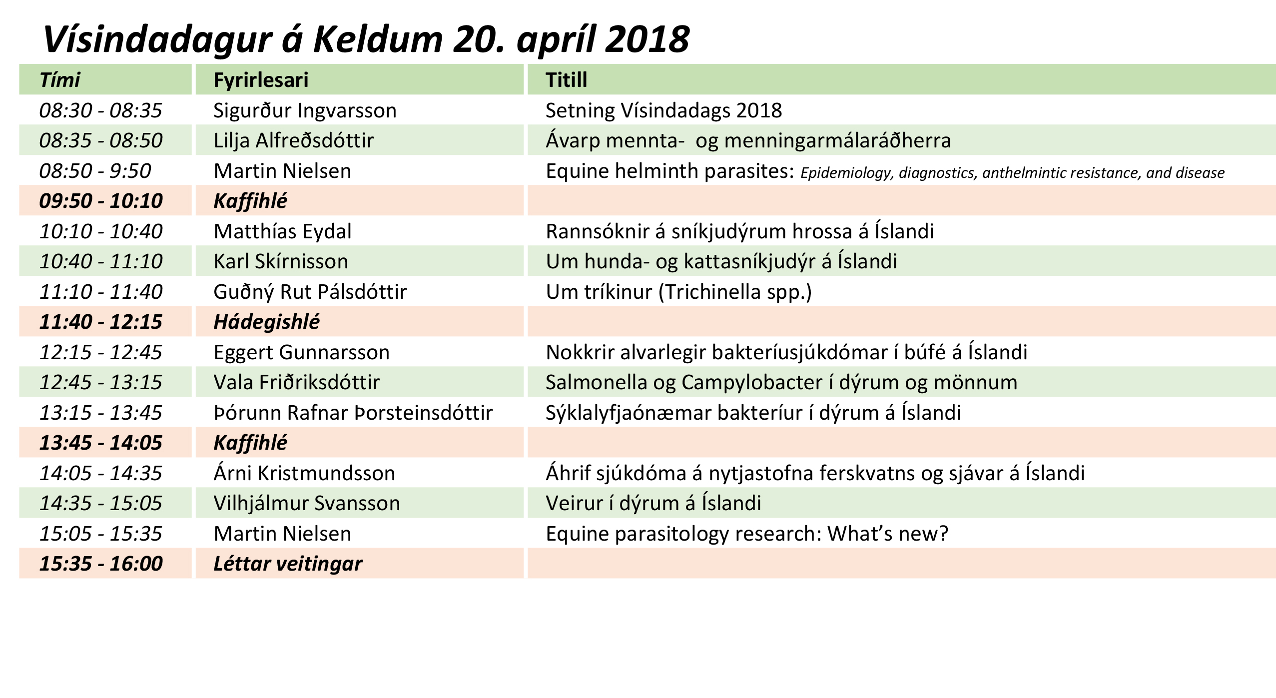Ráðstefnan verður haldin í bókasafni Tilraunastöðvarinnar og er aðgangur öllum heimill og að kostnaðarlausu. Á Vísindadegi Keldna 2018 verður fræðsluefni um helstu nýjungar í rannsóknum og greiningum á dýrasjúkdómum. Vísindadagurinn verður samráðsvettvangur hagsmunaaðila, einkum dýralækna og starfsmanna í dýrasjúkdómageiranum. Stefnt er að því að koma saman starfsmönnum Keldna og starfandi dýralæknum á Íslandi á þessum vísindadegi. Níu fyrirlesarar munu sjá um fræðsluna, einn gestur erlendis frá, hinir eru sérfræðingar á Keldum. Erlendi gestafyrirlesarinn er Martin Krarup Nielsen frá University of Kentucky ? Maxwell H. Gluck Equine Research Center, sérfræðingur í sníkjudýrum, og hann mun halda tvo fyrirlestra. Í vísindanefndinni sem sér um undirbúning og skipulag eru: Sigurbjörg Þorsteinsdóttir, Stefanía Þorgeirsdóttir og Þórunn Sóley Björnsdóttir.