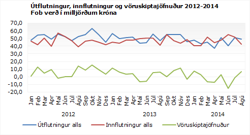 Samkvæmt bráðabirgðatölum á vef Hagstofu Íslands fyrir ágúst 2014 var útflutningur fob 49,3 milljarðar króna og innflutningur fob var 42,8 milljarðar króna. Vöruskiptin í ágúst, reiknuð á fob verðmæti, voru því hagstæð um 6,5 milljarða króna samkvæmt bráðabirgðatölum.