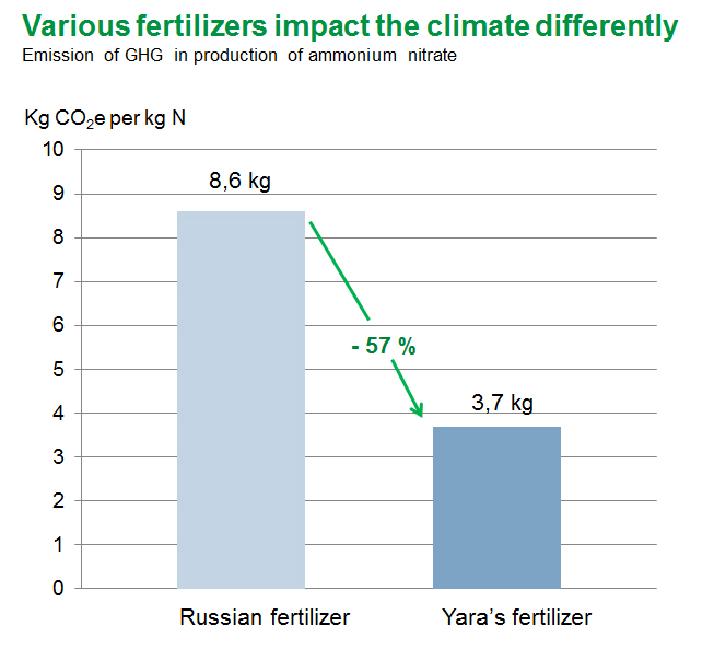 Val á áburði ákvarðar kolefnisfótspor frá búskap og gríðarlegur munur er á milli mismunandi tegunda af áburði þegar að framleiðsluaðferðum kemur. Grafið hér að neðan sýnir verulega minni losun frá framleiðslu ammóníumnítrats í áburðarverksmiðjum Yara í samanburði við áburð sem framleiddur er í Rússlandi. Meginmunurinn er afrakstur markviss starfs innan Yara varðandi orkunýtingu og hreinsibúnaðartækni með N2O-efnahvata sem hefur dregið úr losun gróðurhúsalofttegunda um yfir 50 prósent.