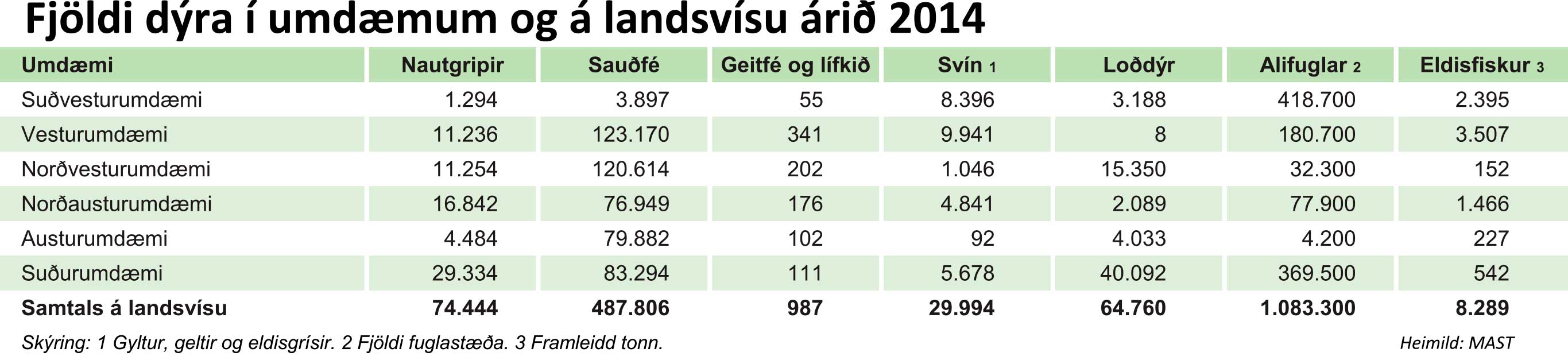 Búfé á Íslandi á árinu 2014 var samkvæmt tölum Matvælastofnunar (MAST) samtals 657.991 fyrir utan alifugla og eldisfisk. Með alifuglunum er talan 1.741.291 dýr að því er fram kemur í nýrri starfsskýrslu stofnunarinnar og eldisfiskurinn er talinn 8.289 tonn.