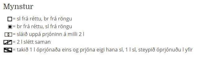 Prjónar: Hringprjónar 40 cm nr 3 og 3,5 – eða sú stærð sem þarf til að 22 L og 30 umf í sléttu prjóni verði 10 x 10 cm á prjóna nr 3,5.