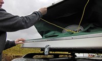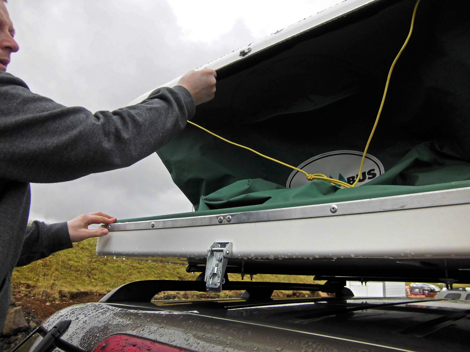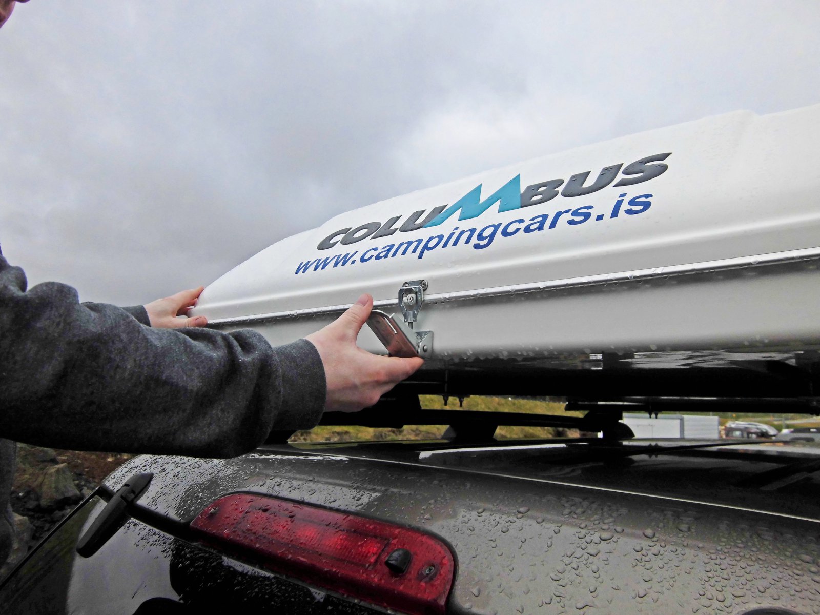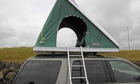 Tjaldið sem ég var hrifnastur af heitir Columbus og kostar 377.000. Þetta tjald er með hörðum botni og þaki, en því eins og öllum öðrum tjöldum frá topptjald.is fylgir stigi til að komast upp á þak. Það er bara ein smella sem þarf að losa og þá ýtir maður bara tjaldinu upp, teygir sig í stigann. Inni í tjaldinu er svo ein stífa sem þarf að festa þá er tjaldið tilbúið til notkunar. Þessu tjaldi fylgir dýna eins og öðrum tjöldum frá Topptjaldi.