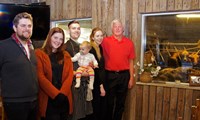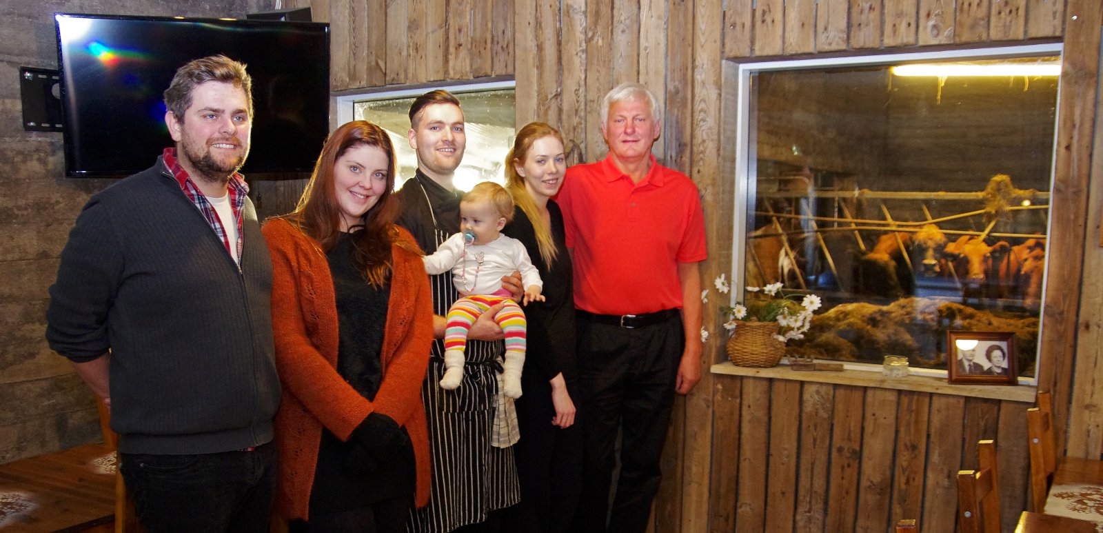 Fjölskyldan í Efstadal á neðri hæðinni í veitingahúsinu, þar sem fylgjast má með kúnum í gegnum glugga. Talið frá vinstri; Sölvi Arnarson og Kristín Ingunn Haraldsdóttir, Árni Benónýsson og Guðrún Karítas Snæbjörnsdóttir með barn sitt á milli sín og Snæbj