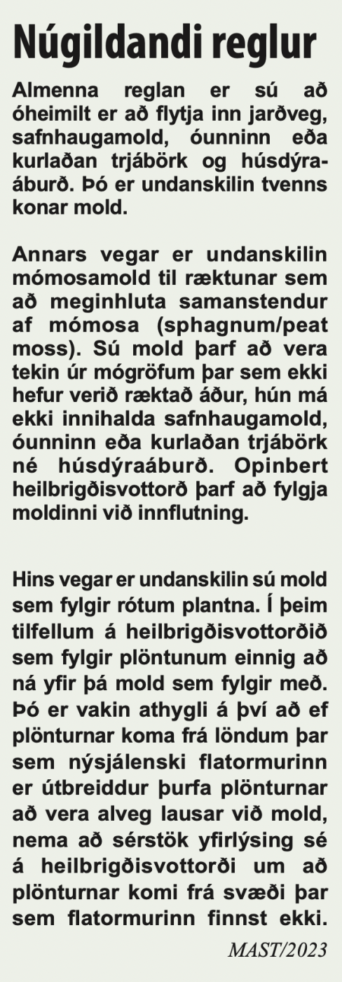 Þórhildur Ísberg, fagsviðsstjóri plöntuheilbrigðis hjá Matvæla- stofnun, segir að eins og sakir standa séu sömu skilyrði og áður um innflutning á mold/sphagnum frá óræktuðum svæðum Evrópu með plöntuheilbrigðisvottorð, sbr. reglugerð 189/1990.