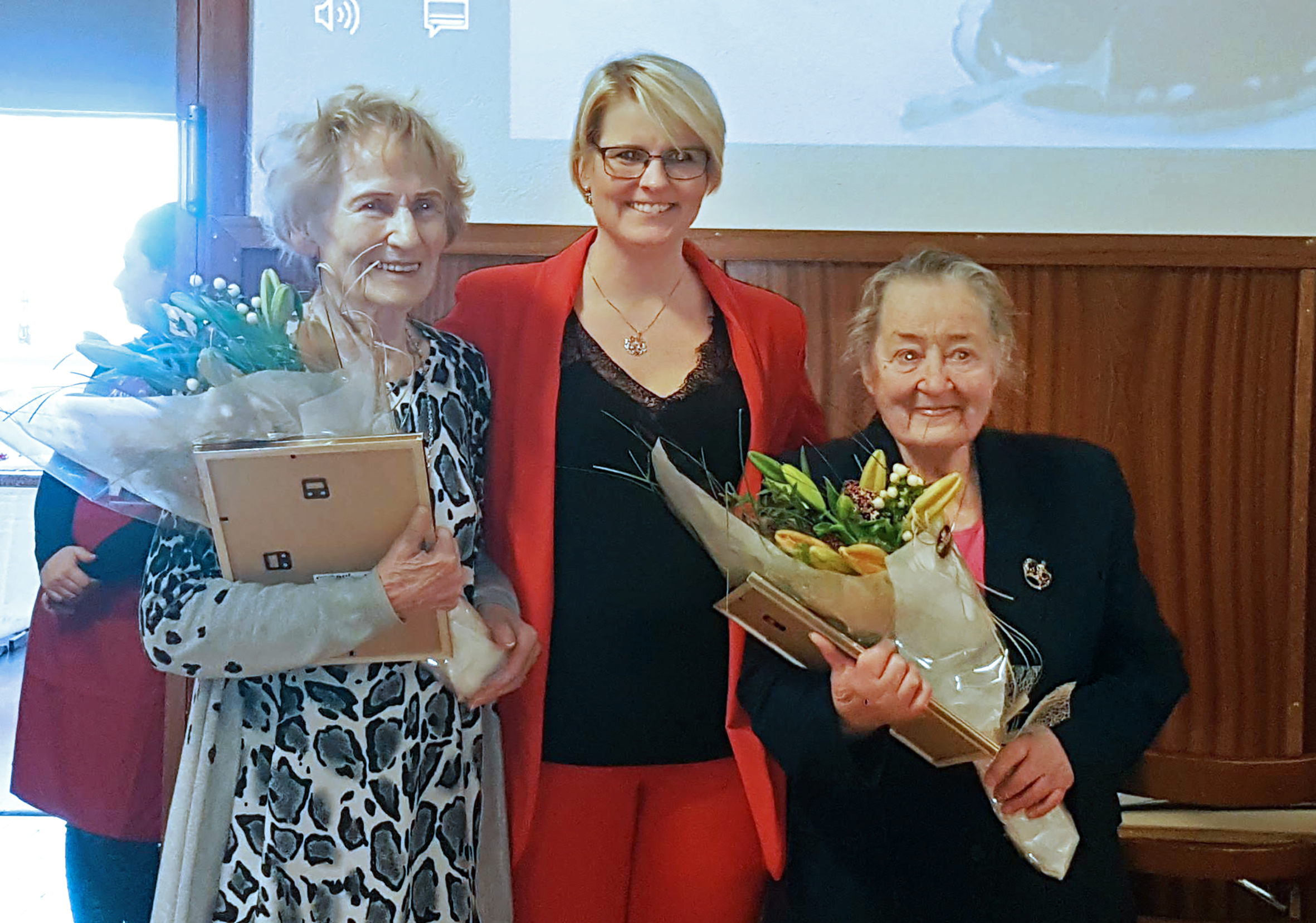 Í afmælinu voru tvær konur heiðraðar fyrir vel unnin störf, þær Guðný Guðnadóttir (lengst til vinstri á myndinni) og Guðrún Fanný Björnsdóttir. Með þeim á myndinni er Guðrún Oddný Schmidt, formaður félagsins.