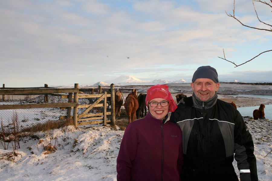Sigríður Heiðmundsdóttir og Viðar Steinarsson ábúendur að Kaldbak á ofanverðum Rangárvöllum með snævi þakta Heklu í bakgrunninum.