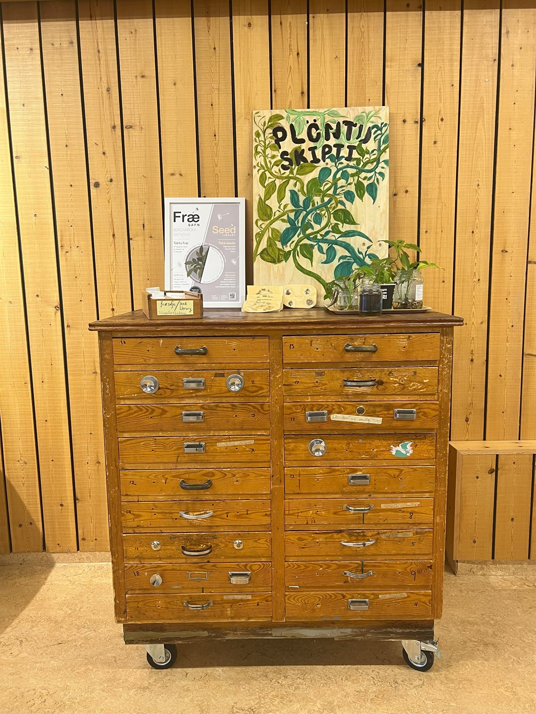 Þessi kommóða hefur fengið nýtt hlutverk og hýsir nú fræbanka Gerðubergs.