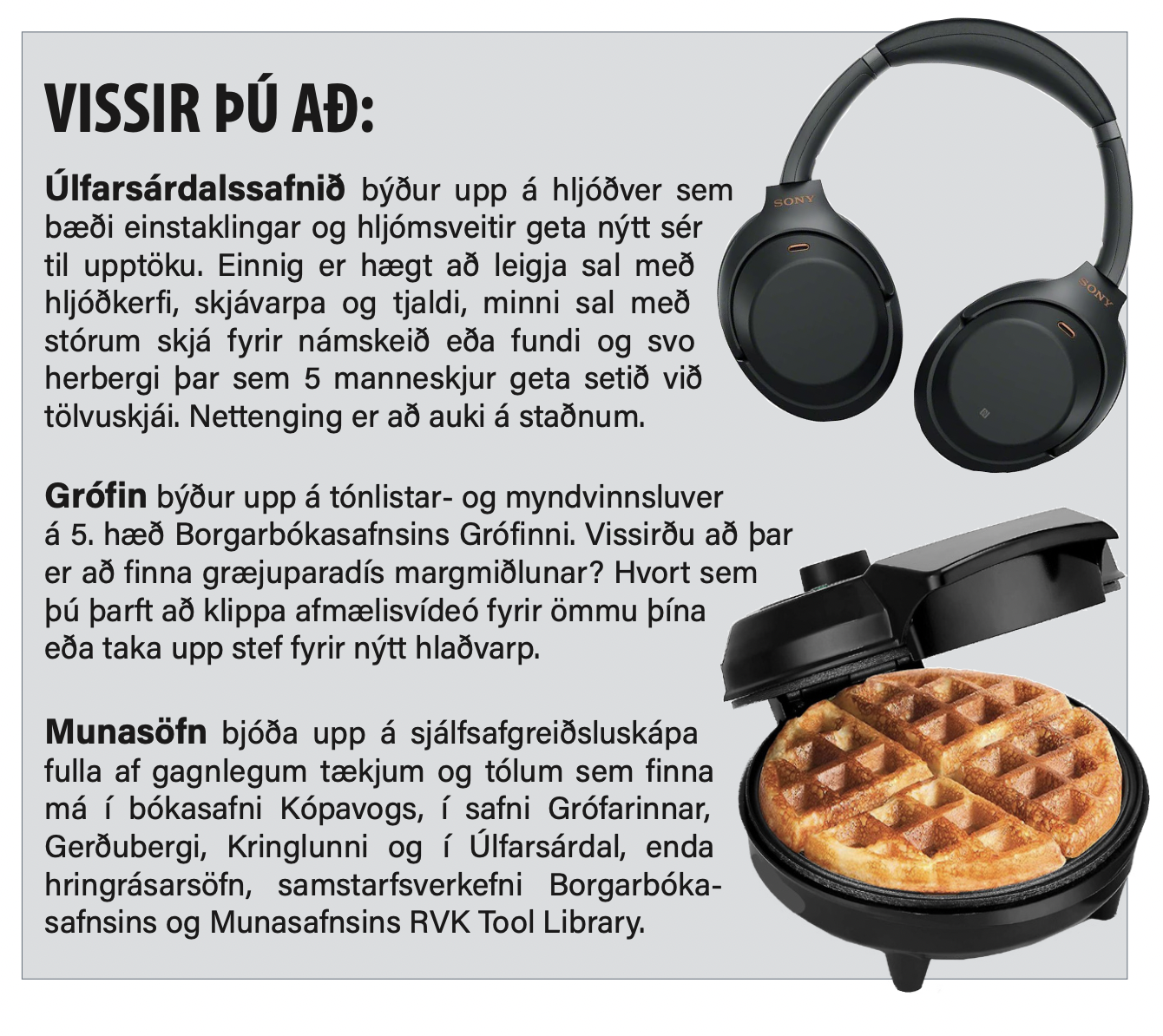 Munasafn má einnig finna innan veggja bókasafns Gerðubergs, en áskrift þar er hægt að samnýta í munasöfn annarra bókasafna og eru afar vel sótt. Það segir Ilmur annan vinkil, enda upplagt að geta náð sér í vöfflujárn, snjóskóflu eða annað þegar þess þarfnast.