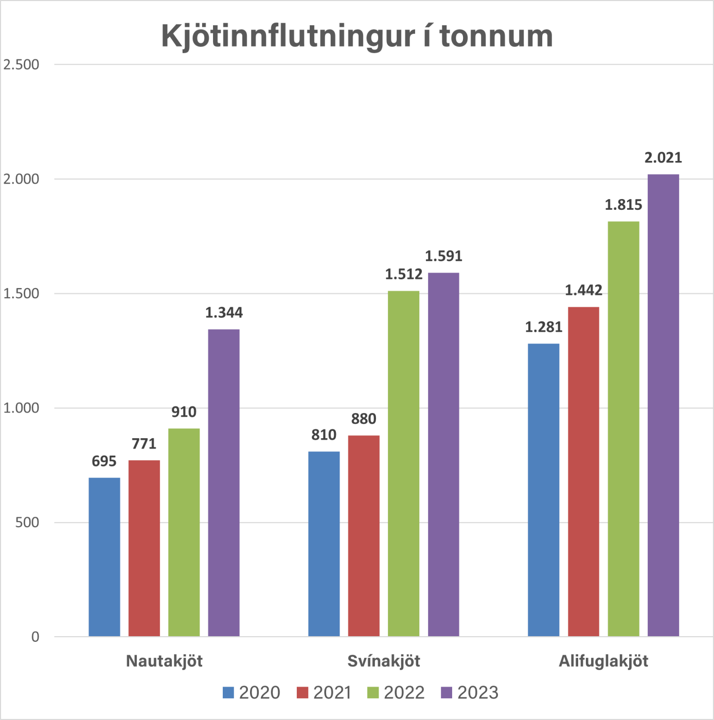 Aldrei hefur meira magn verið flutt inn af nautakjöti en á síðasta ári, eða 1.344 tonn, sem er um 48% aukning frá 2022.