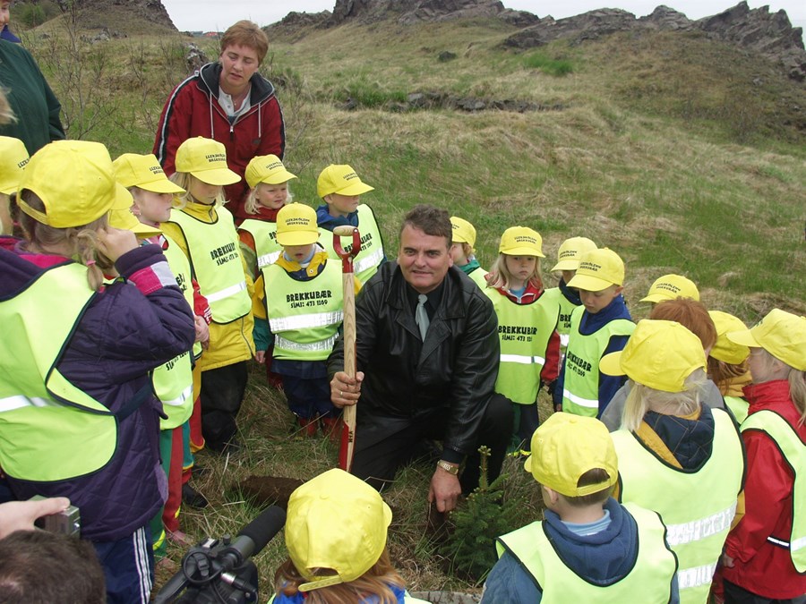 Frá gróðursetningu fyrsta trés Austurlandsskóga í júní 2002. Guðni Ágústsson, þáverandi landbúnaðarráðherra, sýnir börnum af leikskólanum Brekkubæ í Vopnafirði handtökin. Við þessa athöfn undirritaði ráðherra jafnframt fyrsta nytjaskógasamninginn í Austurlandsskógum við Guðmund Wiium Stefánsson skógræktarbónda að Fremra-Nýpi og Helga Gíslason, framkvæmdastjóra Austurlandsskóga.