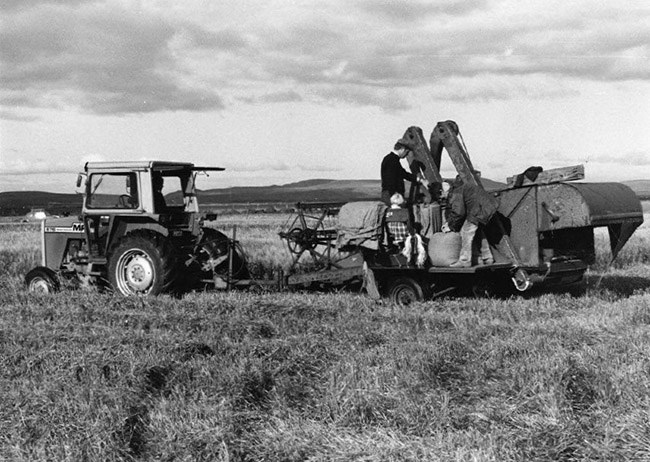 Kornskurður á Búlandi í Austur-Landeyjum haustið 1981. Mynd sem birtist í þriðja tölublaði Freys árið 1982.