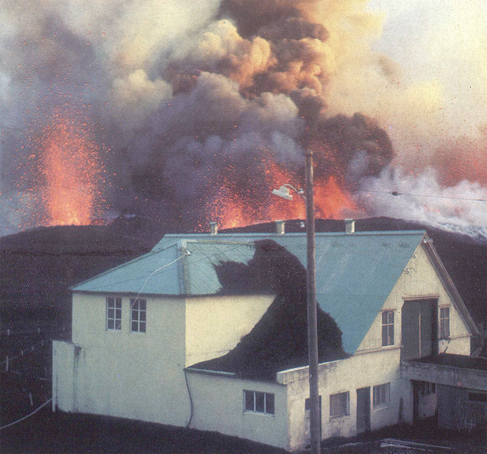 Húsið Kirkjubær stendur þarna á fyrsta degi gossins í Heimaey árið 1973. Degi síðar höfðu glóandi hraunslettur
