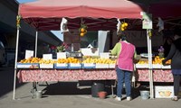 Pallbílum er lagt fyrir aftan bása og borð sem bera ólíkar afurðir, enda ríkið eitt fjölbreyttasta landbúnaðarsvæði heims með um 250 tegundir í ræktun.