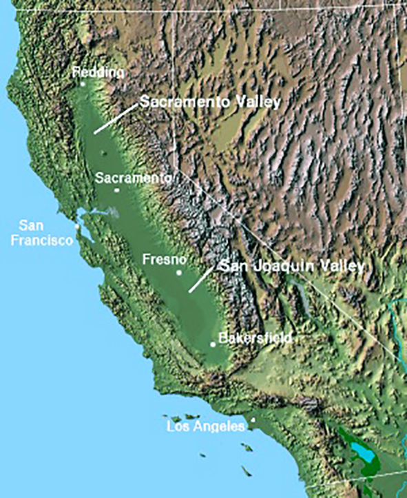 Norðan við sömu fjöll er landsvæði sem fæðir annars konar hungur, kennt við Central Valley og hefur frá lokum 19. aldar orðið að umfangsmesta og gjöfulasta landbúnaðarsvæði heims.