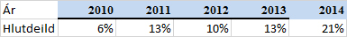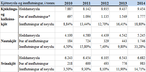 Meðfylgjandi tafla sýnir þróun innflutnings þessara þriggja kjöttegunda og hlutdeild innflutnings í heildarneyslu árin 2010 – 2014:
