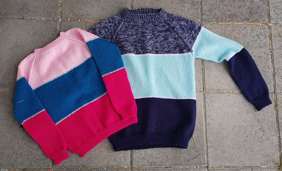 Peysan er prjónuð í hring ofan frá og niður. Útaukningar á berustykki móta laskalínuna. Hver litaröð er 11,5 (13) 14,3 (15,5) 17 (18,3) cm og 2 umferðir með Twinkle prjónaðar slétt á milli litaskipta.