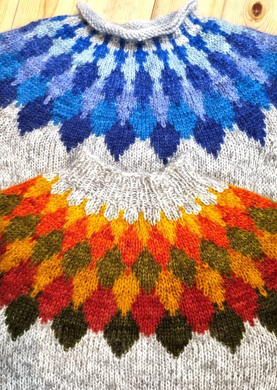 Gamla uppskriftin var með lengri tungum og var gefin upp fyrir Álafosslopa eða þrefaldan plötulopa. Þessi er aftur á móti fyrir tvöfaldan lopa, sem er mun algengari þykkt á peysum nútímans. Á gömlu peysunni eru margir litir i hverri mynsturtungu, en hér er einn litur í hverri, sem gefur peysunni allt annan svip. Það er gaman að spreyta sig á að setja saman liti í þessa. Það eru gefnir upp 7 litir í mynstrið, en það má líka alveg fækka þeim í fjóra eða fimm, eftir smekk hvers og eins.