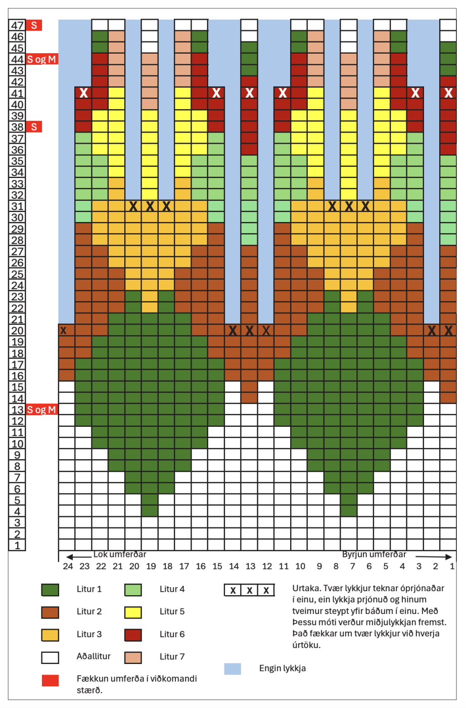 Efni:400-400-450-450-500g Þingborgarlopi í sauðalit í aðallitinn og 4-7 litir. Slettuskjótt í mynsturliti. Prjónað er úr lopanum tvöföldum, Slettuskjótt er tvöfaldur Þingborgarlopi í 50 g dokkum. Í tvo fyrstu litina þarf 50 g af hvorum lit en minna af hinum litunum. Slettuskjótt fæst einnig í 100 g pakkningum með nokkrum litum saman.