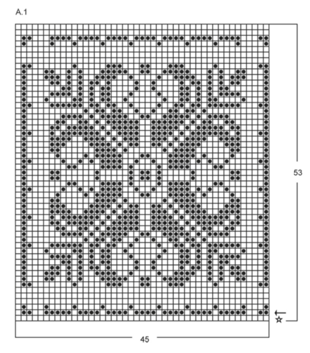 Prjónið síðan MYNSTUR frá 2. umferð í A.1 (= 45 lykkjur) alls 2 sinnum í umferð. Þegar A.1 hefur verið prjónað 1 sinni á hæðina, fitjið upp 20 nýjar lykkjur í umf (haldið áfram með litnum rauður). Snúið við, fellið af 20 l sem fitjaðar voru upp og fellið síðan af þær 90 l sem eftir eru frá röngu.