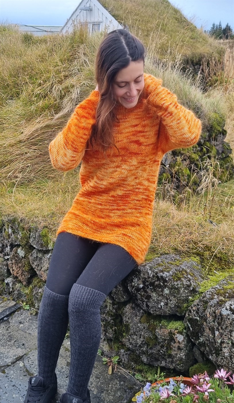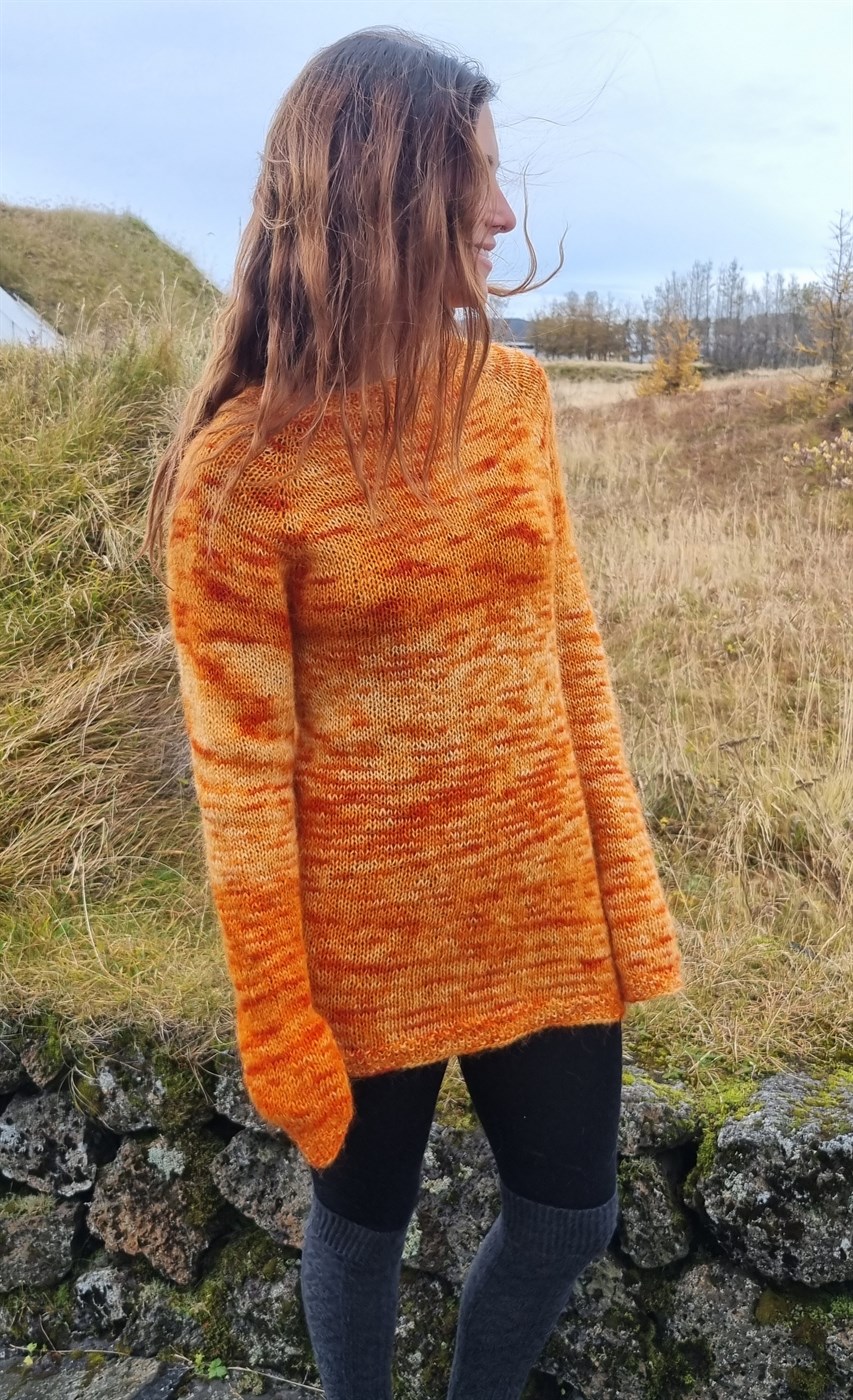 Úrtaka: Laskaúrtaka:Tekið er úr á fjórum stöðum, alltaf þar sem bolur og ermi mætast. 1.umf.: Prjónið þar til 3 l eru eftir að prjónamerki, prjónið 2 l slétt saman, 2 l slétt, prjónamerki situr mitt á milli þessa tveggja lykkja. Lyftið 1 l af prjóni eins og prjóna eigi slétt, 1 l slétt, steypið lyftu lykkjunni yfir. Endurtakið við öll hin prjónamerkin sem eftir eru (= 8 lykkjur færri). 2. og 3. umf.: Prjónað slétt yfir allar lykkjur. Þessar þrjár umferðir eru endurteknar þar til 76/80 lykkjur eru eftir á prjóninum (notið styttri hringprjón þegar lykkjum fækkar). Skiptið yfir á sokkaprjóna nr. 4.5 og prjónið perluprjón 10 umf. Fellið laust af. Gangið frá endum og þvoið í volgu sápuvatni og leggið á handklæði til þerris.