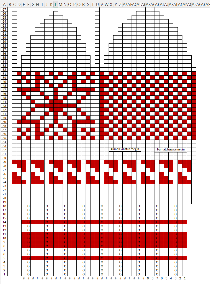 Prjónfesta: 20 l og 26 umferðir gera 10x10 sm. Ef notaður er lopi eða annað band en gefið er upp hér þarf að gæta að prjónfestu. Lesið uppskriftina yfir áður en hafist er handa. Mynsturblaðið sýnir lykkjufjölda, útaukningu, mynstur og úrtöku, hver rúða táknar eina lykkju. Feita strikið sem nær yfir 7 lykkjur sýnir hvar á að prjóna aukaband fyrir þumli.
