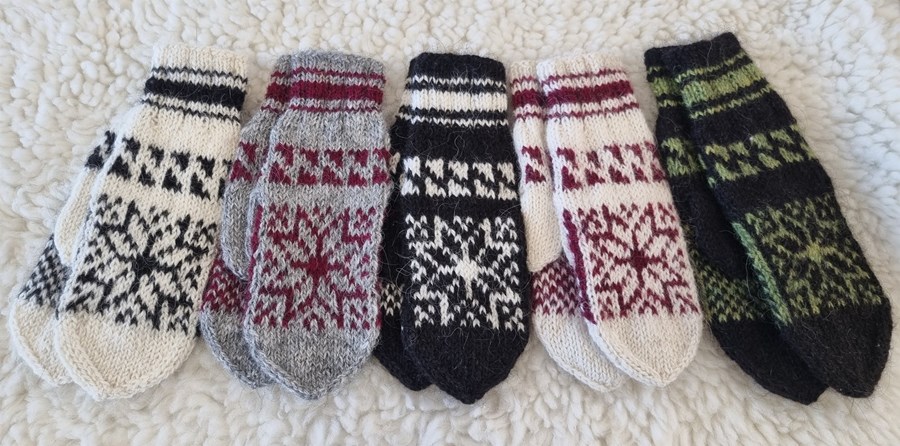 Þvottur: Þvoið vettlingana í höndum með mildri sápu eða þvottaefni. Skolið, kreistið vatnið vel úr og leggið til þerris.