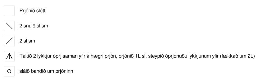 Skammstafanir: L = lykkja/lykkjur / sl = slétt / br = brugðið / sm = samman / PM = prjónamerki / * * = markar endurtekningu / Klykkja-sl = prjónið kantlykkjur slétt / út-V = útaukning vinstri halli / út-H = útaukning hægri halli / 2 snúið sl sm = prjónið 2L saman í aftari lykkjubogann. Peysan er prjónuð ofan frá og niður. Það eru prjónaðar 4 kantlykkjur slétt í upphafi og enda allra umferða.