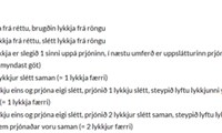 Umferð 1 (réttan): Takið 1 lykkju óprjónaða,*sláið uppá prjóninn, prjónið 16 lykkjur slétt, takið 2 lykkjur saman óprjónaðar (eins og prjóna eigi þær slétt saman) prjónið 1 lykkju slétt, steypið óprjónuðu lykkjunum yfir, prjónið 16 lykkjur slétt, sláið uppá prjóninn, prjónið 1 lykkju slétt* Endurtakið frá *-* út umferðina og endið á 16 lykkjur slétt, sláið uppá prjóninn, 1 lykkja slétt