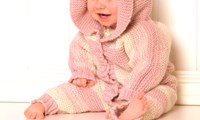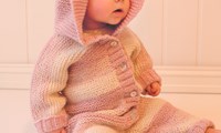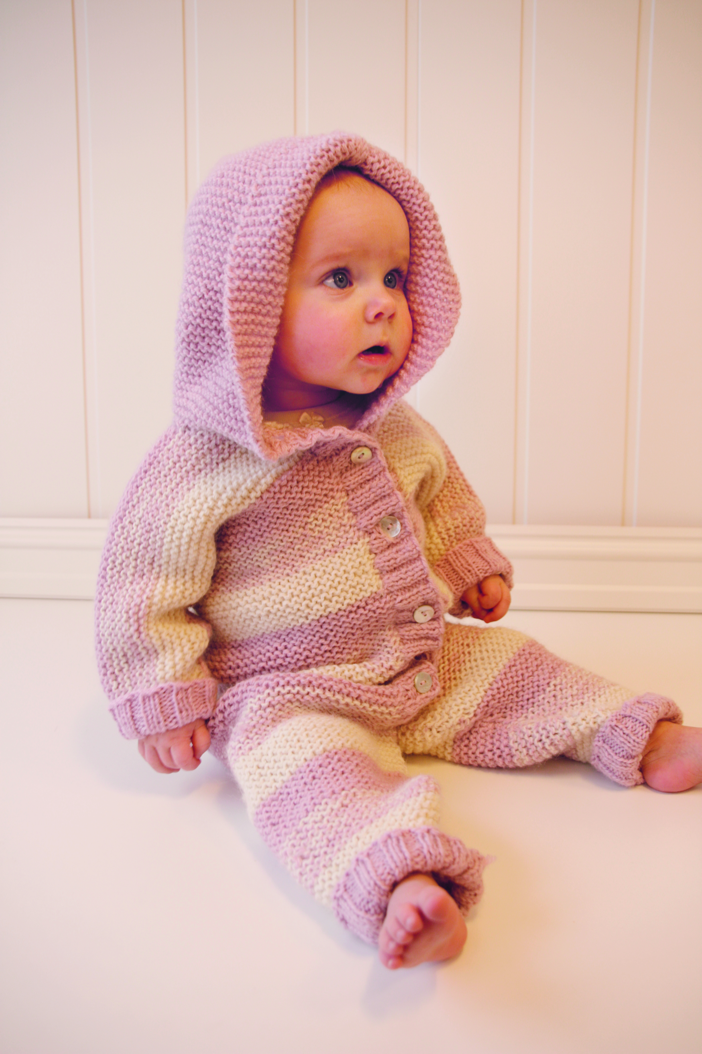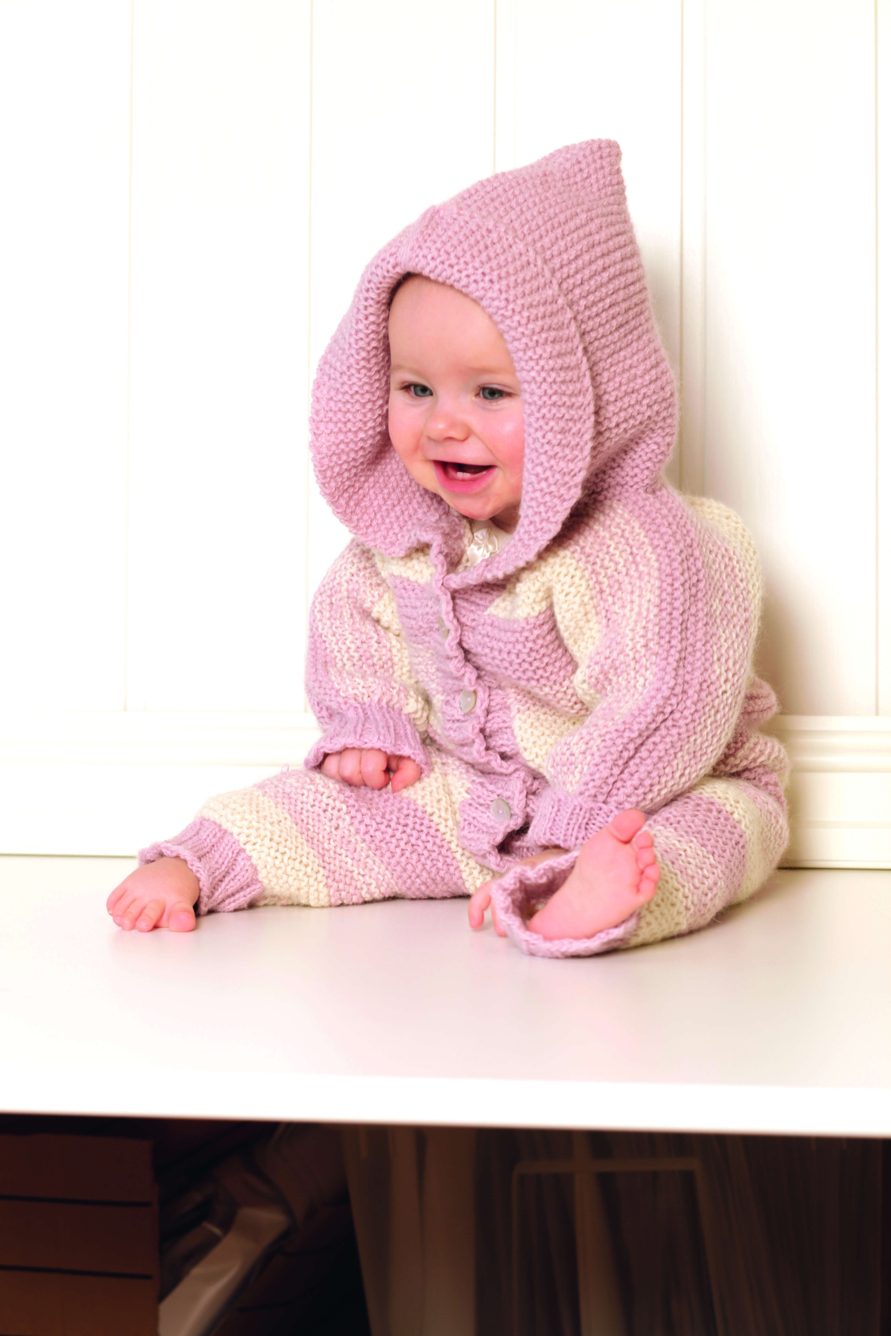 Prjónið upp ca 50 til 60 l, í kringum hálsmál frá réttu, á hringprjóna nr 5 með 2 þráðum af dauf bleikum (prjónið einnig upp yfir kant að framan). Prjónið síðan garðaprjón – JAFNFRAMT í 2. umf (= frá réttu) er aukið út jafnt yfir til 72-76-80-84 (88-92) l. (Ef þið viljið ekki hafa hettu þá er fellt af eftir 4 umf garðaprjón). Þegar hettan mælist 19-21-23-25 (27-28) cm fellið af. Leggið hettuna saman tvöfalda og saumið hana saman að ofan með lykkjuspori.