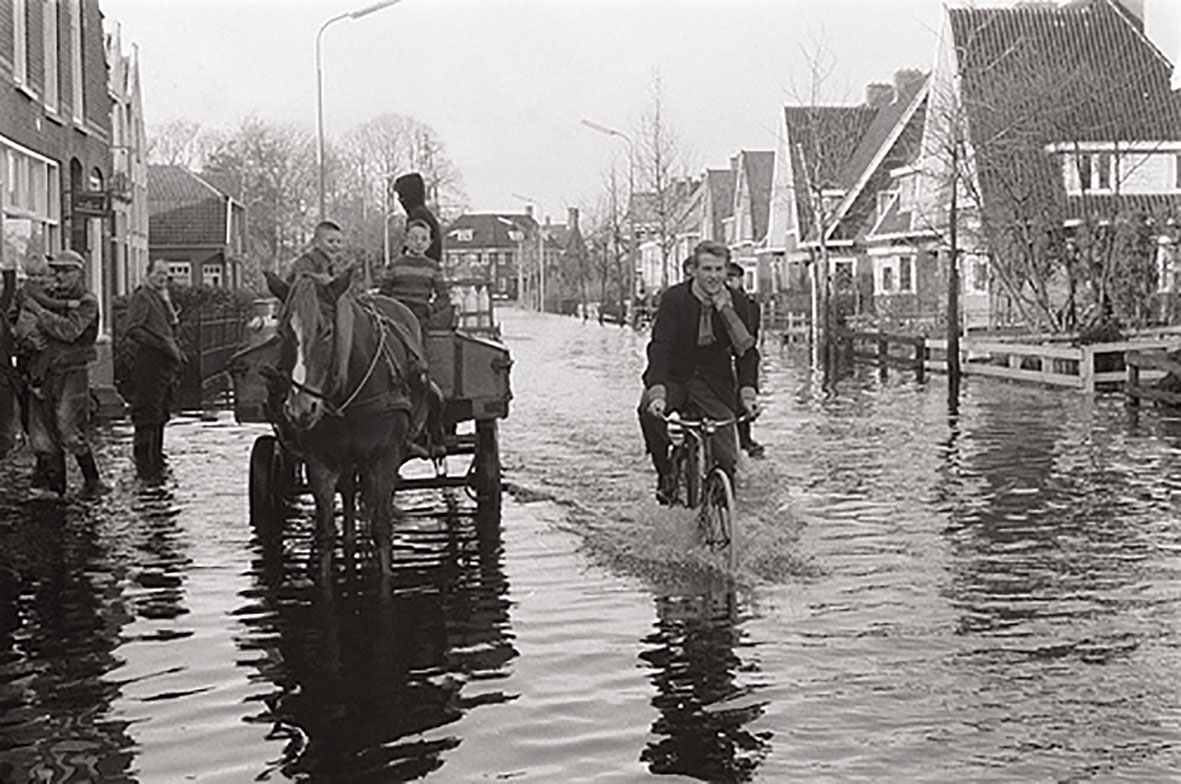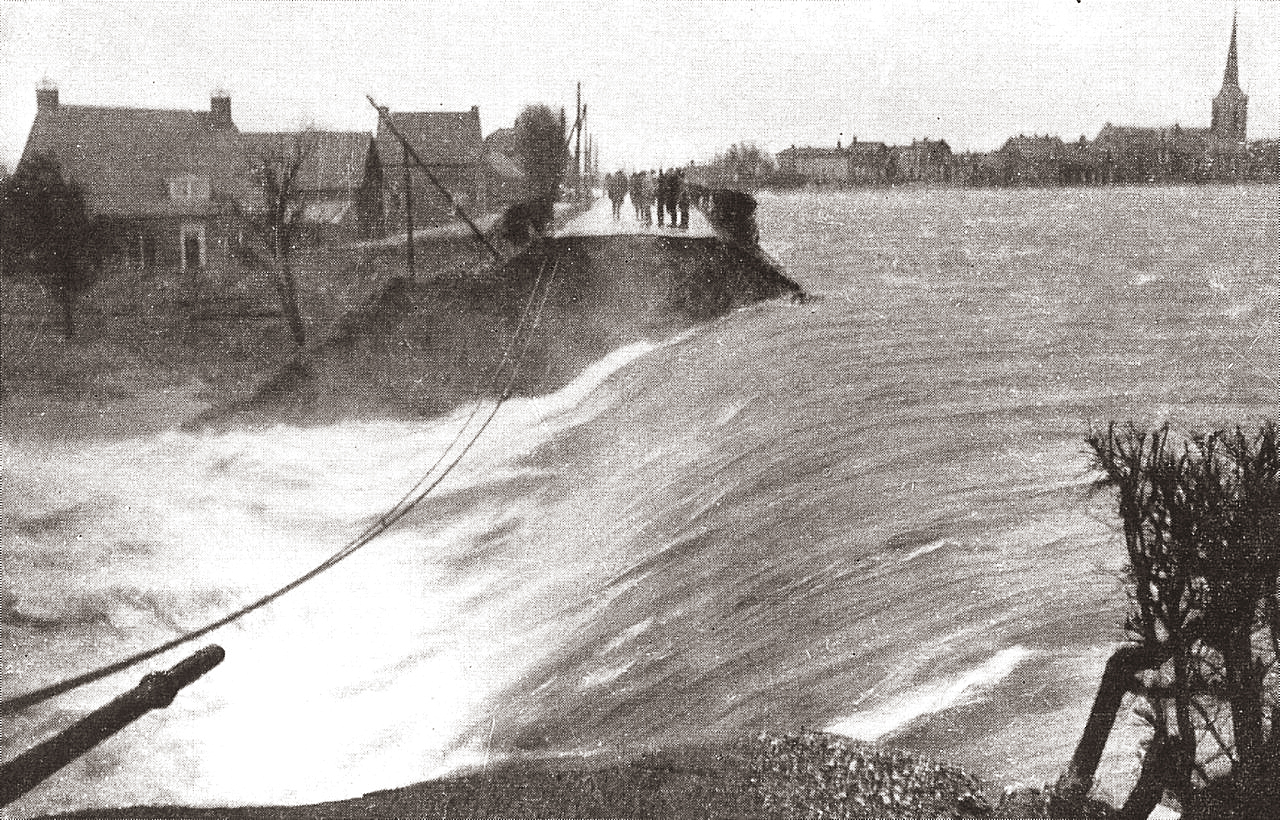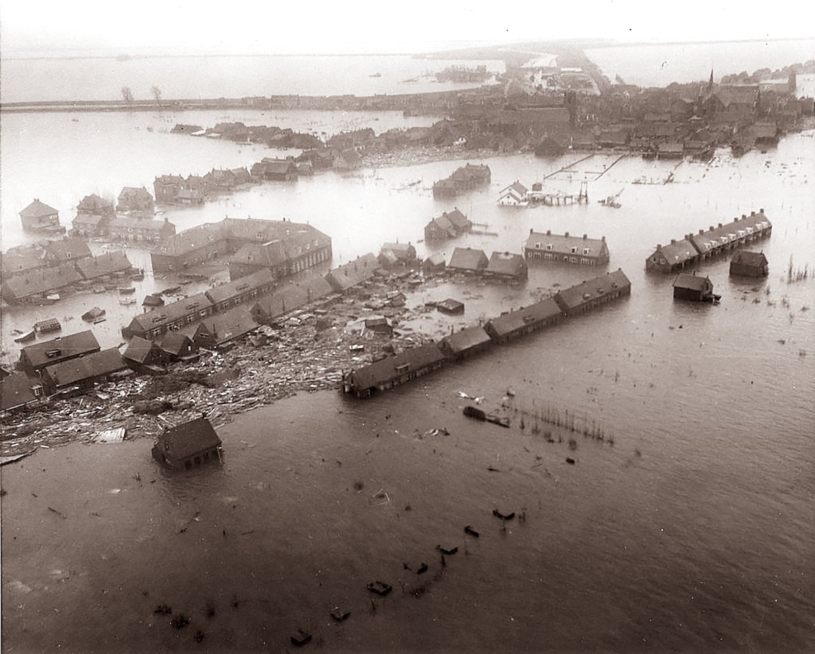 Þessi mynd var tekin úr bandarískri herþyrlu af þorpi í Bevelamnd Zuid Beveland í Hollandi í febrúar 1953. Að kvöldi laugardagsins 31. janúar skall á mikið óveður sem blés af Norðursjónum og buldi látlaus öldugangur á sjóvarnargörðum Hollendinga. Þeir gáf